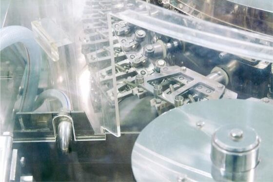 縦の回転盤の構造、マニピュレーターが付いているびん、回転、および動き、高い洗浄の効率を追跡する洗浄のノズルを締め金で止める。